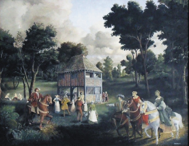 The painting shows the Lords of the Manor visiting the Tudor Wing (the market hall)