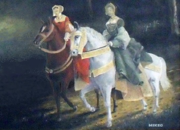 A fourth person, on the chestnut horse on the left, would have been their steward, Richard Jewell, who would have lived at The Jewell House on the Lords' Demesne.